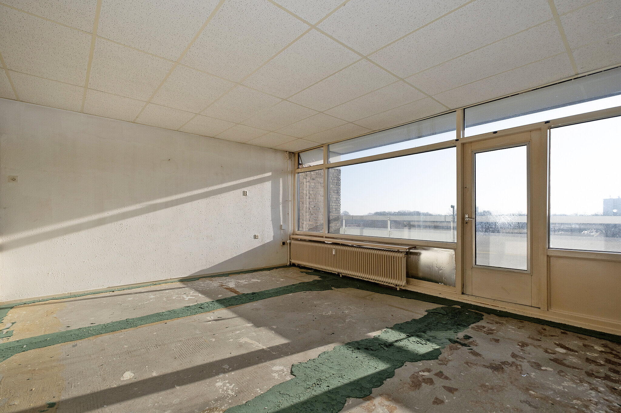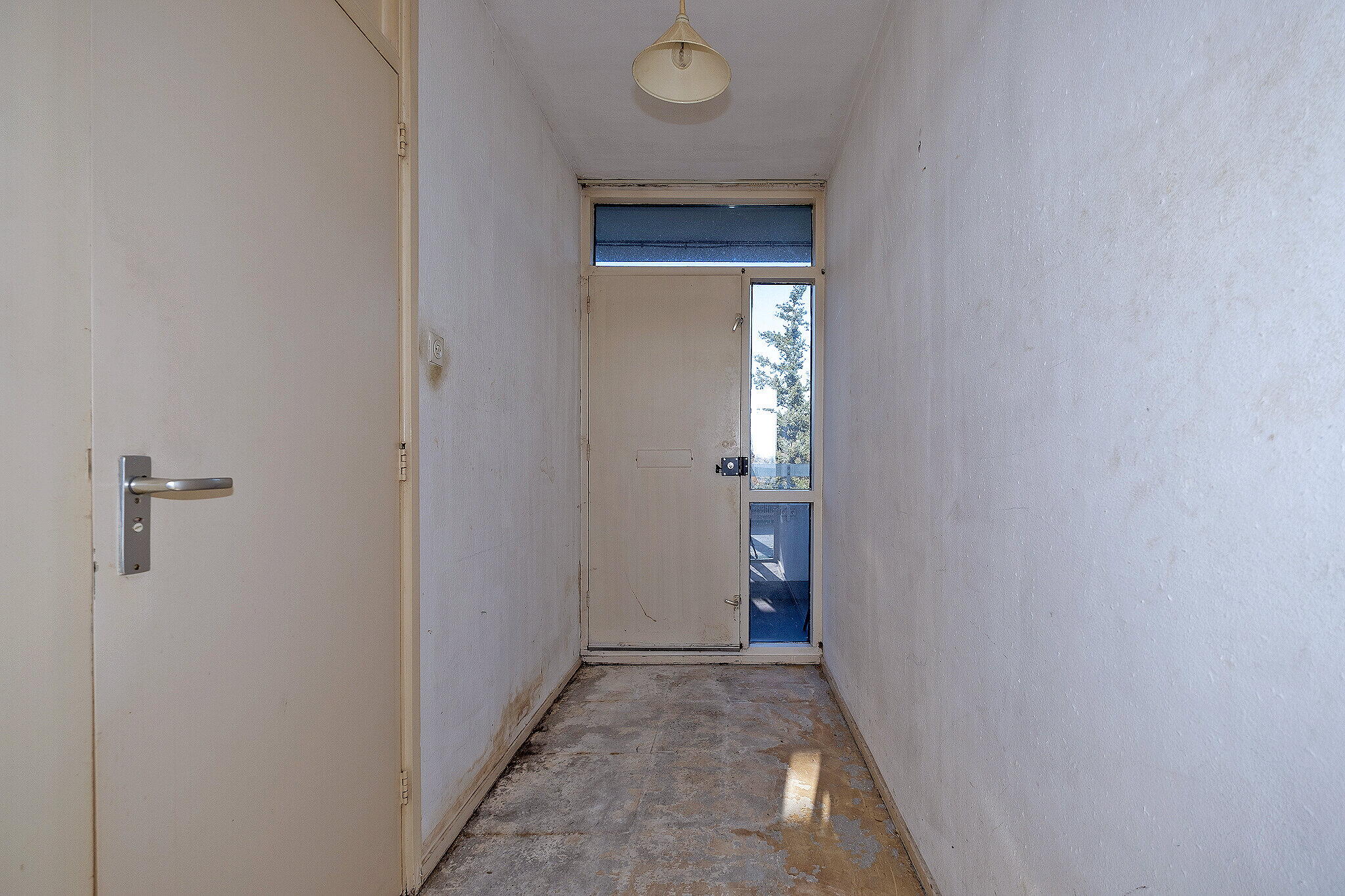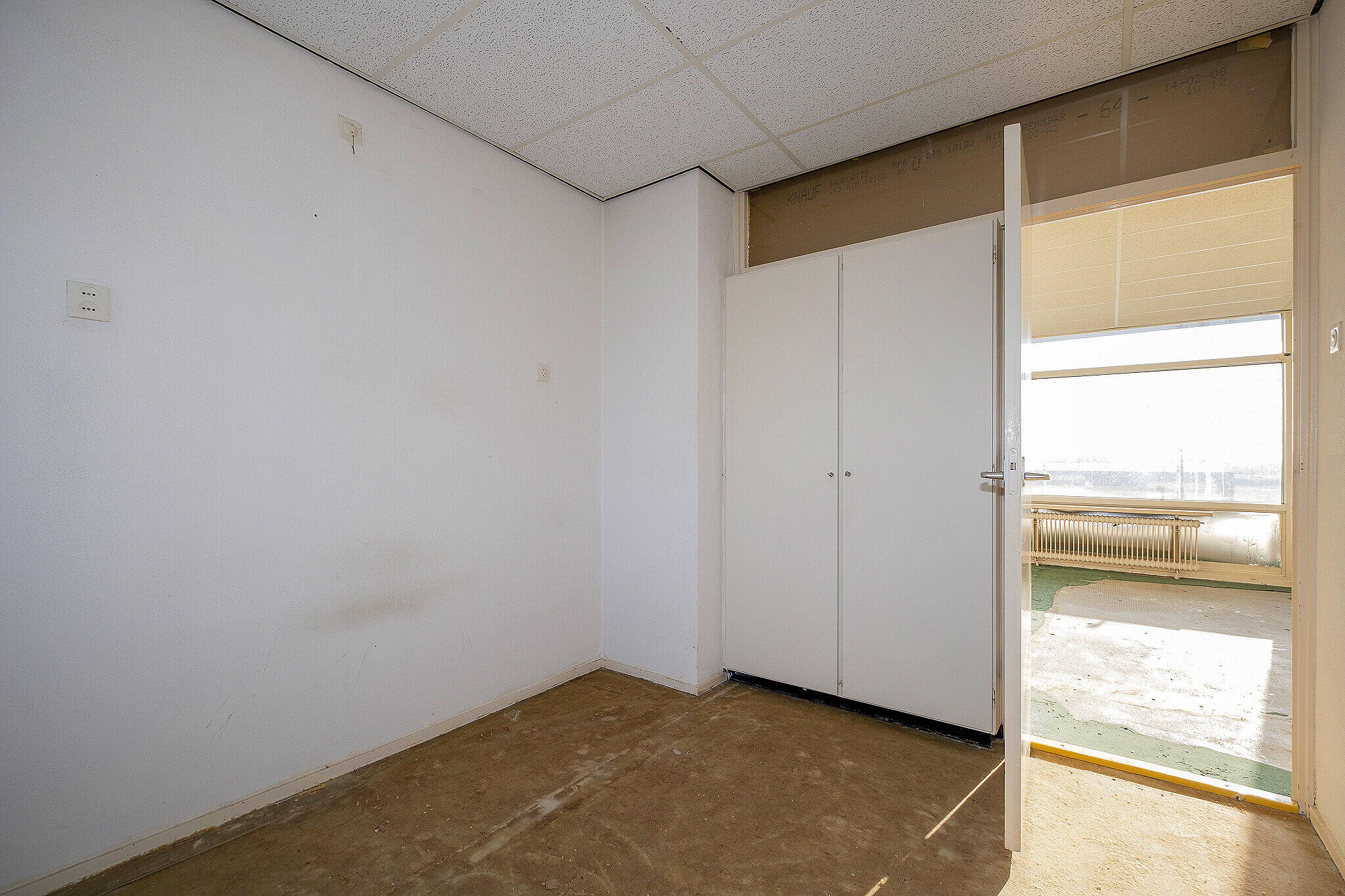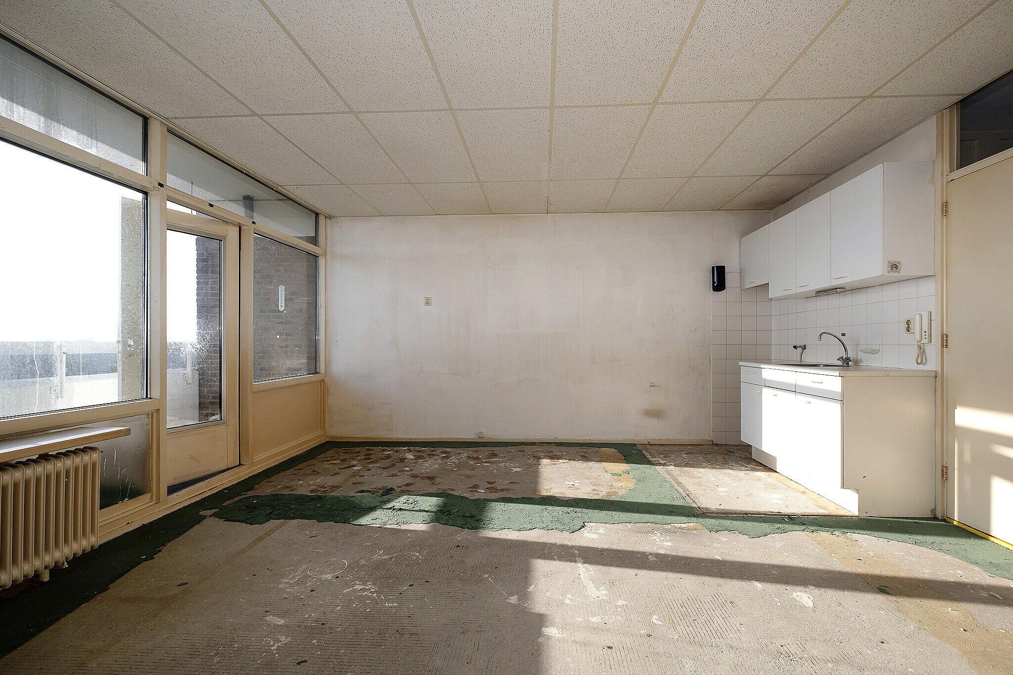 Entree/hal met meterkast. Lichte woonkamer met grote raampartijen en toegang tot het zonnige balkon op het zuiden, waar u geniet van een prachtig uitzicht. Open keuken met eenvoudige keukenopstelling (zonder inbouwapparatuur).