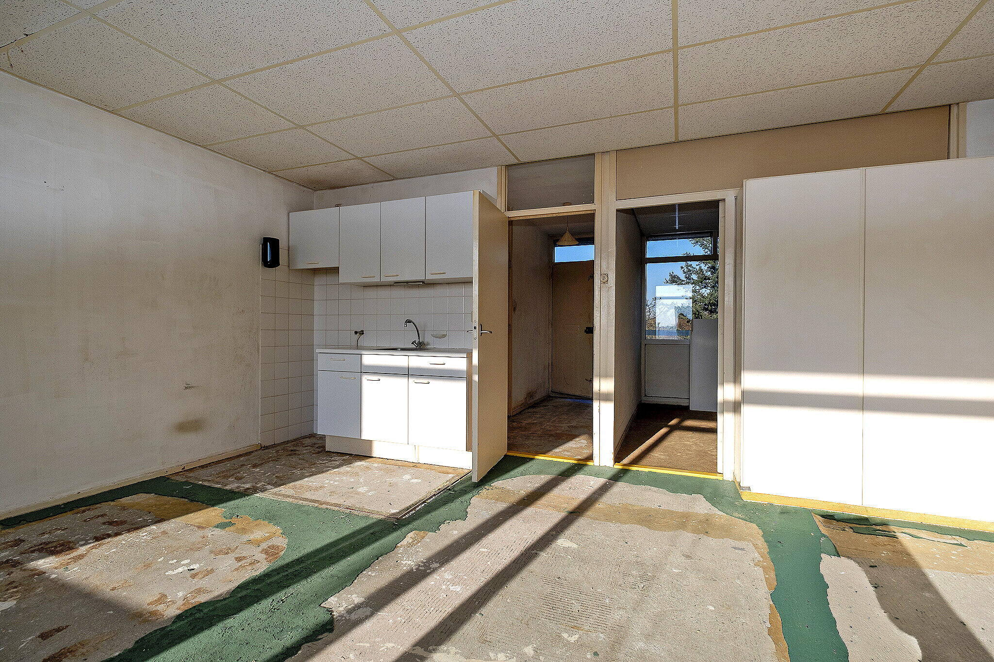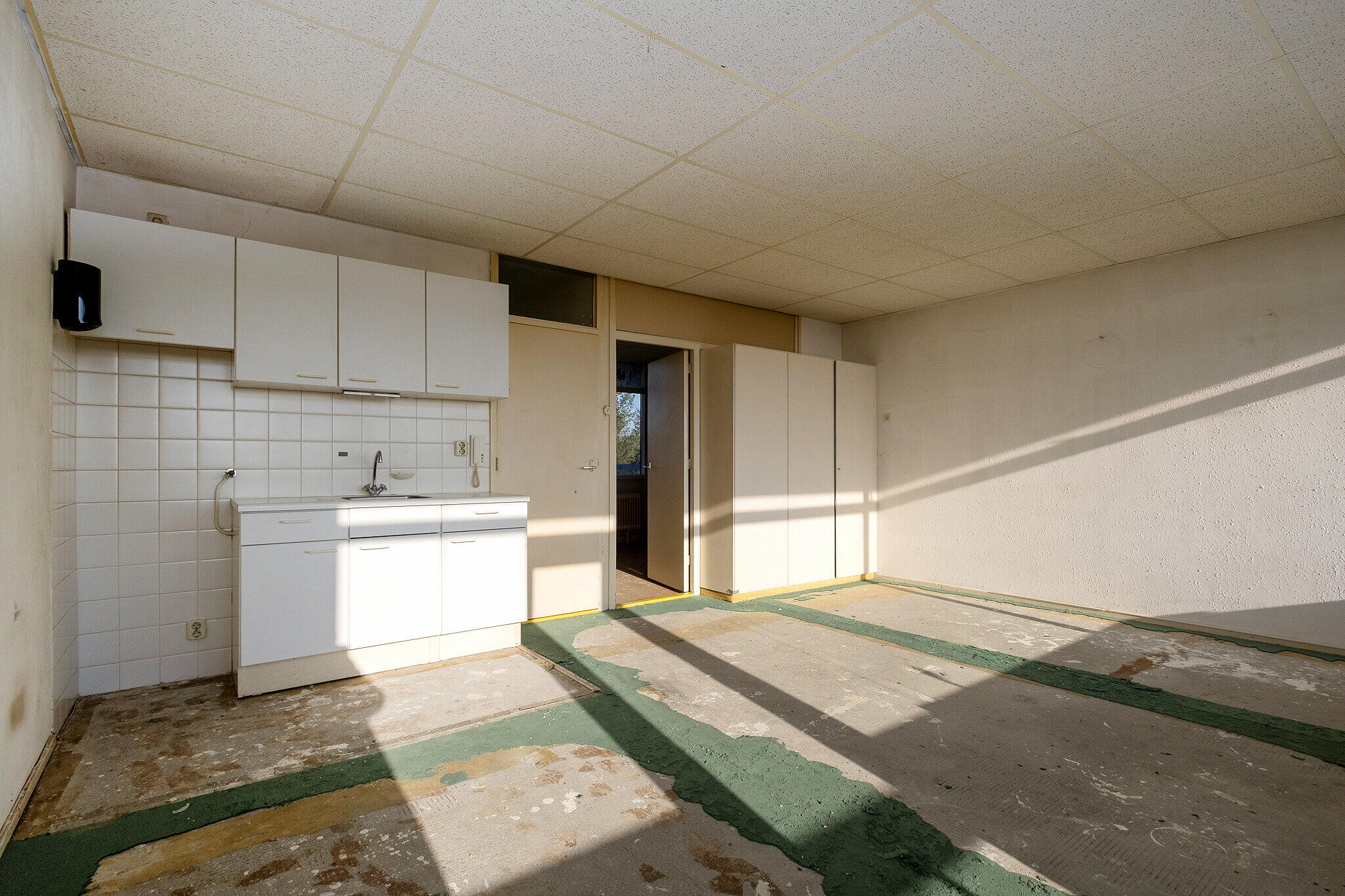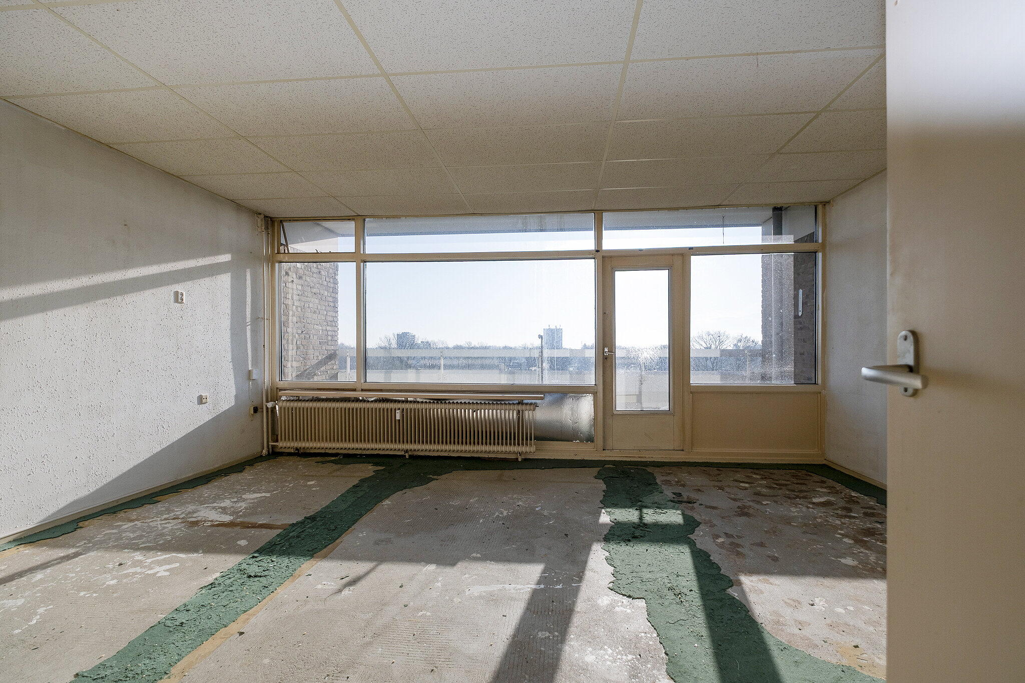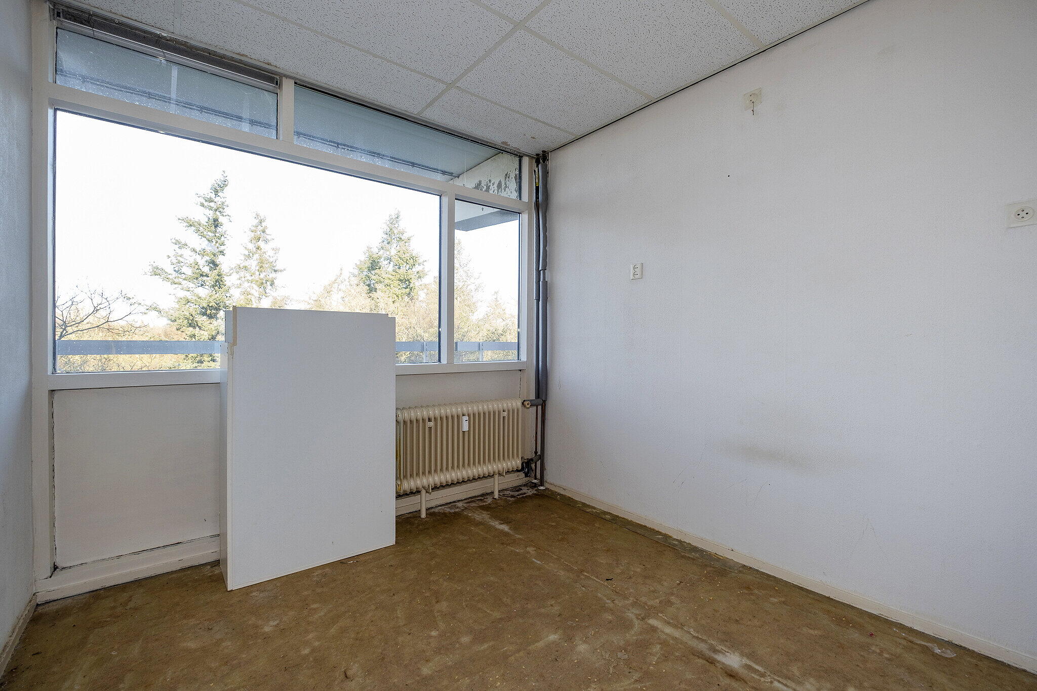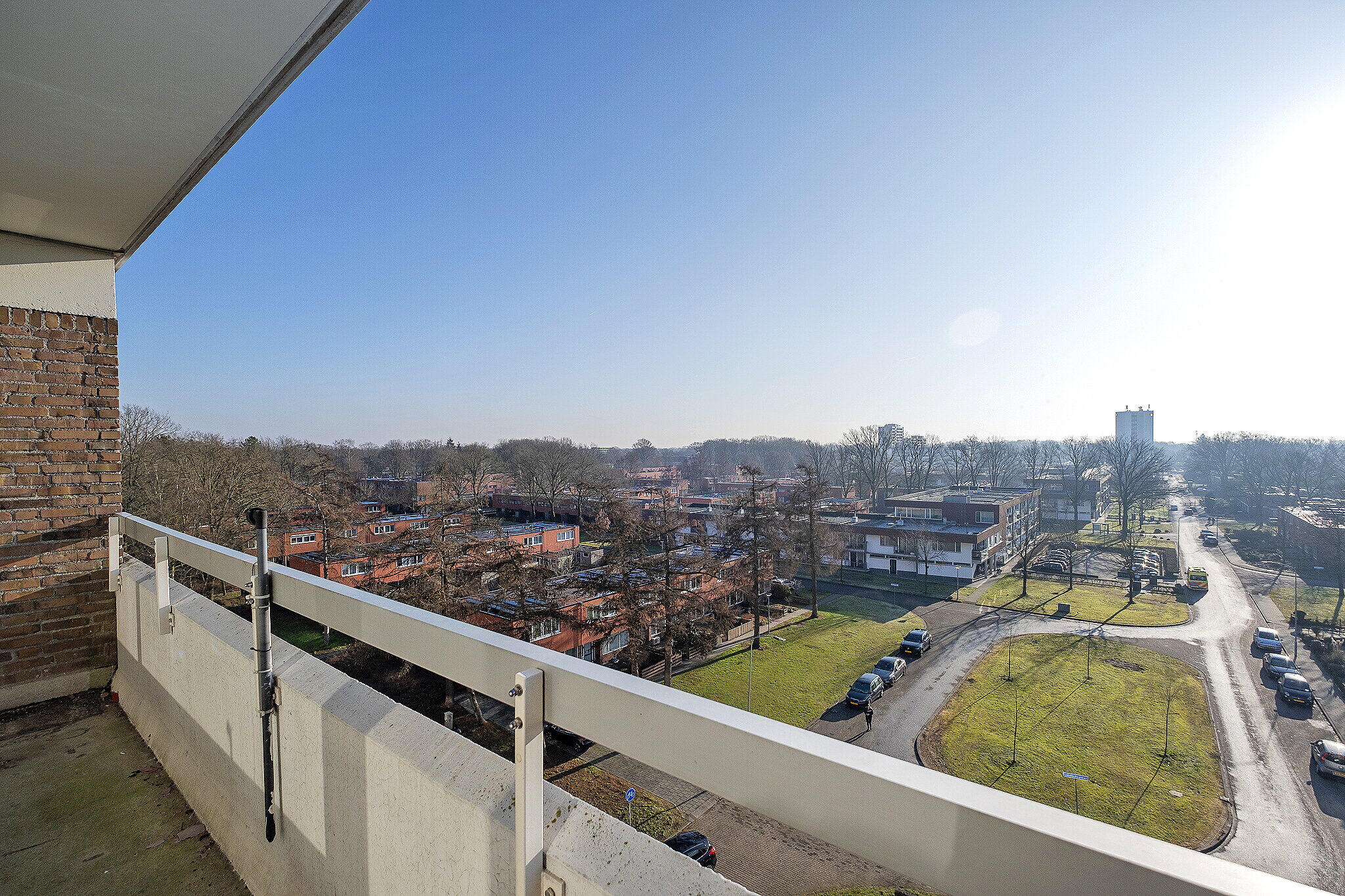 Entree/hal met meterkast. Lichte woonkamer met grote raampartijen en toegang tot het zonnige balkon op het zuiden, waar u geniet van een prachtig uitzicht. Open keuken met eenvoudige keukenopstelling (zonder inbouwapparatuur).