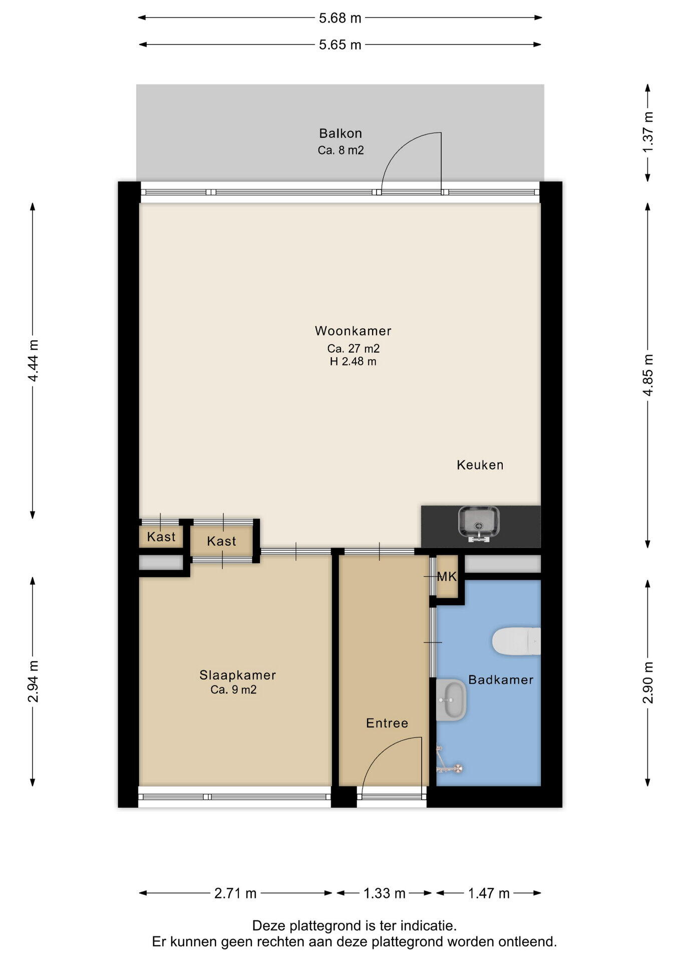 Verder beschikt het appartement over een slaapkamer van ca. 9 m² en een badkamer met douche, wastafel en toilet. Hier bevinden zich tevens de boiler en de aansluiting voor de wasmachine.